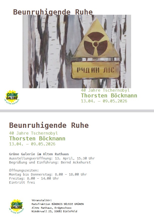 In Erinnerung an 40 Jahre Tschernobyl zeigt die Bielefelder Ratsfraktion von Bündnis 90 / Die Grünen vom 13. April bis 09. Mai in der „Grünen Galerie“ im Alten Rathaus (Niedernwall 25, Erdgeschoss) unter dem Titel „Beunruhigende Ruhe“ Fotografien und Malerei des Spenger Künstlers Thorsten Böckmann.